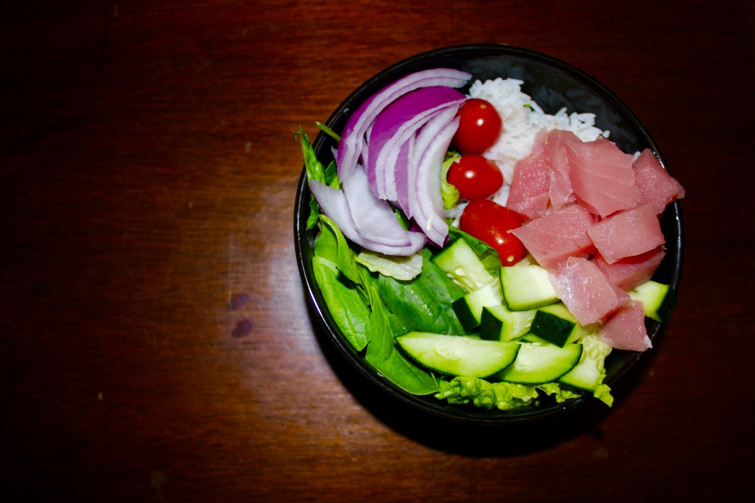 When I was deciding what to eat for lunch I couldn’t help but think about PokeCity, a poke bowl place I just recently discovered. Not wanting to spend a huge amount on eating out, and knowing that I’ve made some awesome poke bowls before I decided to make poke bowls this week. What’s nice is that you can add whatever you want to a poke bowl. I like to add hot rice, so I bring my rice separately and heat it up, then add it to my veggie mix (here it is some leafy greens, cucumber, red onion, and tomatoes), then I add my fish (you can even do chicken if you don’t want fish…or cook your fish if you don’t like it raw), and top it off with a sauce (this time its a sweet chili sauce).