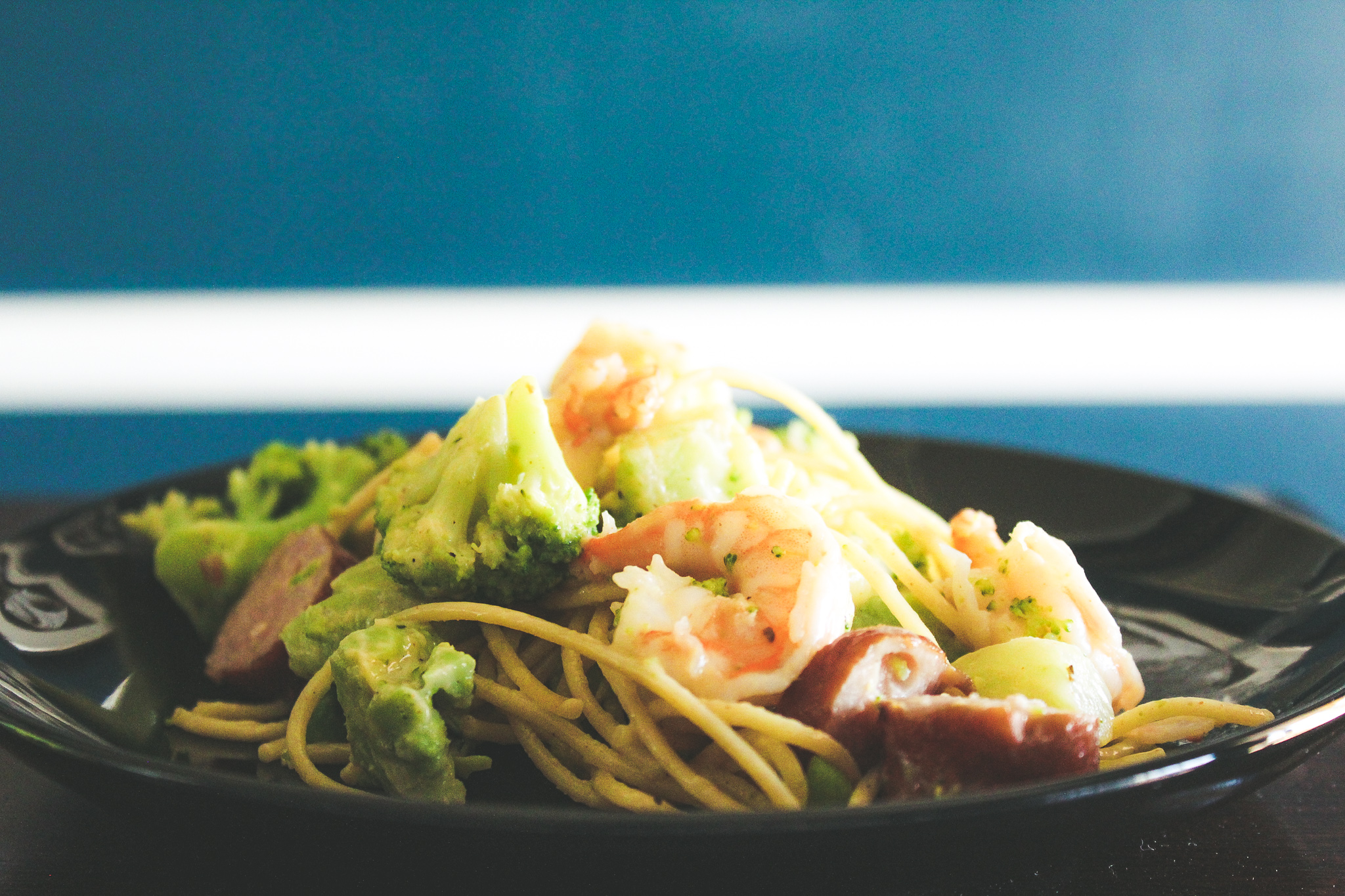 This first dish is a hodge-podge of items. I really wanted noodles and shrimp, but also needed to use up some sausages in my freezer from a BBQ while at the same time wanted to keep it moderately healthy with a veggie. So I cut up the sausage, added some shrimp and frozen broccoli, made some protein noodles and tossed in a jar of Alfredo, and here we are. This was a actually a pretty tasty and easy meal. I enjoyed the mix of proteins with the subtleness of the Alfredo, but maybe next time I will add more Alfredo to make it just a little saucier to match my personality.
