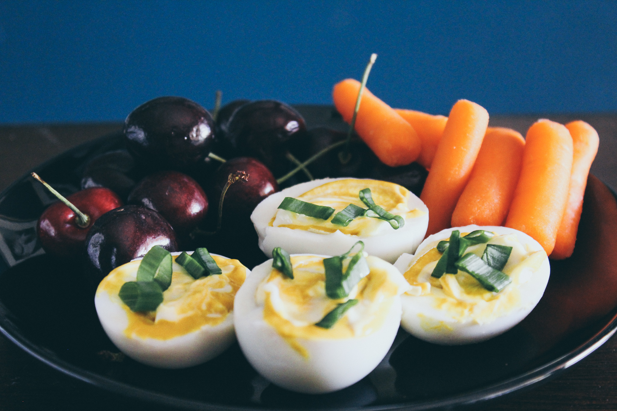 I love deviled eggs but find they are a bit hard to make with very little mayo. So I decided to make hard-boiled eggs and just add very little mayo and mustard to the top. It added just enough favor and made the eggs not so dry! Also, those green onions, I grew them. They are from my garden. I polished off the eggs with some cherries and carrots. What I like about this meal is how flexible it can be. Switch out the cherries for strawberries, raspberries or apple slices and Bam! it’s like a whole new meal! It’s like a Starbucks Protein Box, BUT SO MUCH BETTER and cheaper.