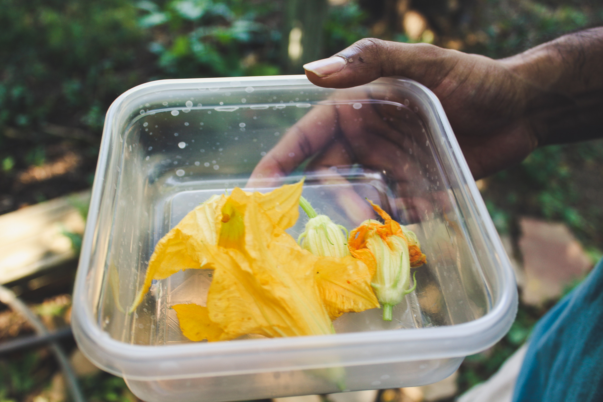Did you know you can eat the flowers that bloom from your squash and zucchini plants? You sure can! Traditionally, people fry these guys after dipping them in an egg bath and then corn meal. However, not having any corn meal, I took a different route.