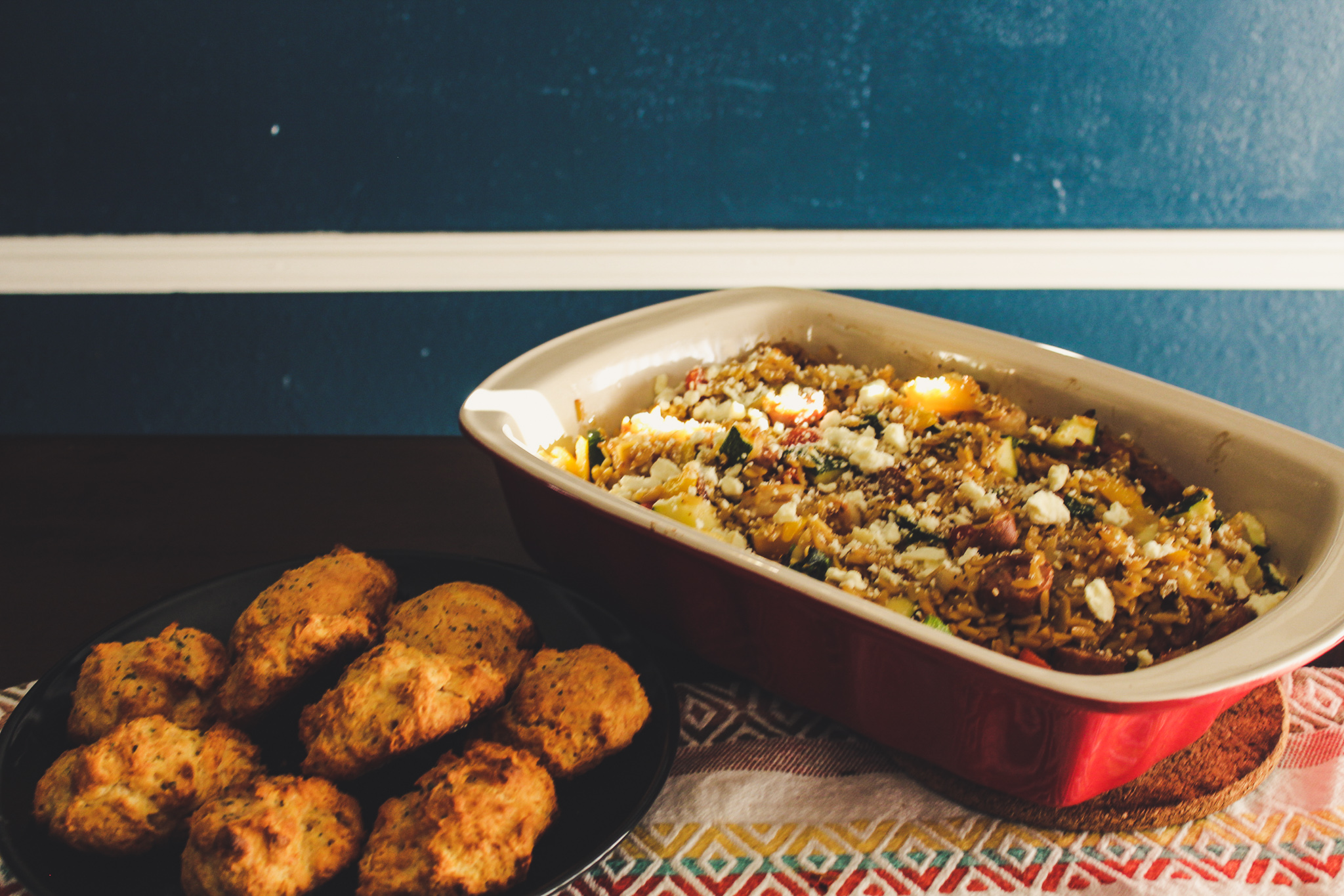 Haris made this beautiful dinner one night this week. In the large dish we have orzo with sausage and shrimp, tomatoes and zucchini, and feta cheese. After you serve it, you add some lemon juice to it. It was amazing and so full of flavor. On the side Haris made some Cheddar Bay Biscuits from Red Lobster and completed the whole meal with a great red wine. It was such a treat to come home to!