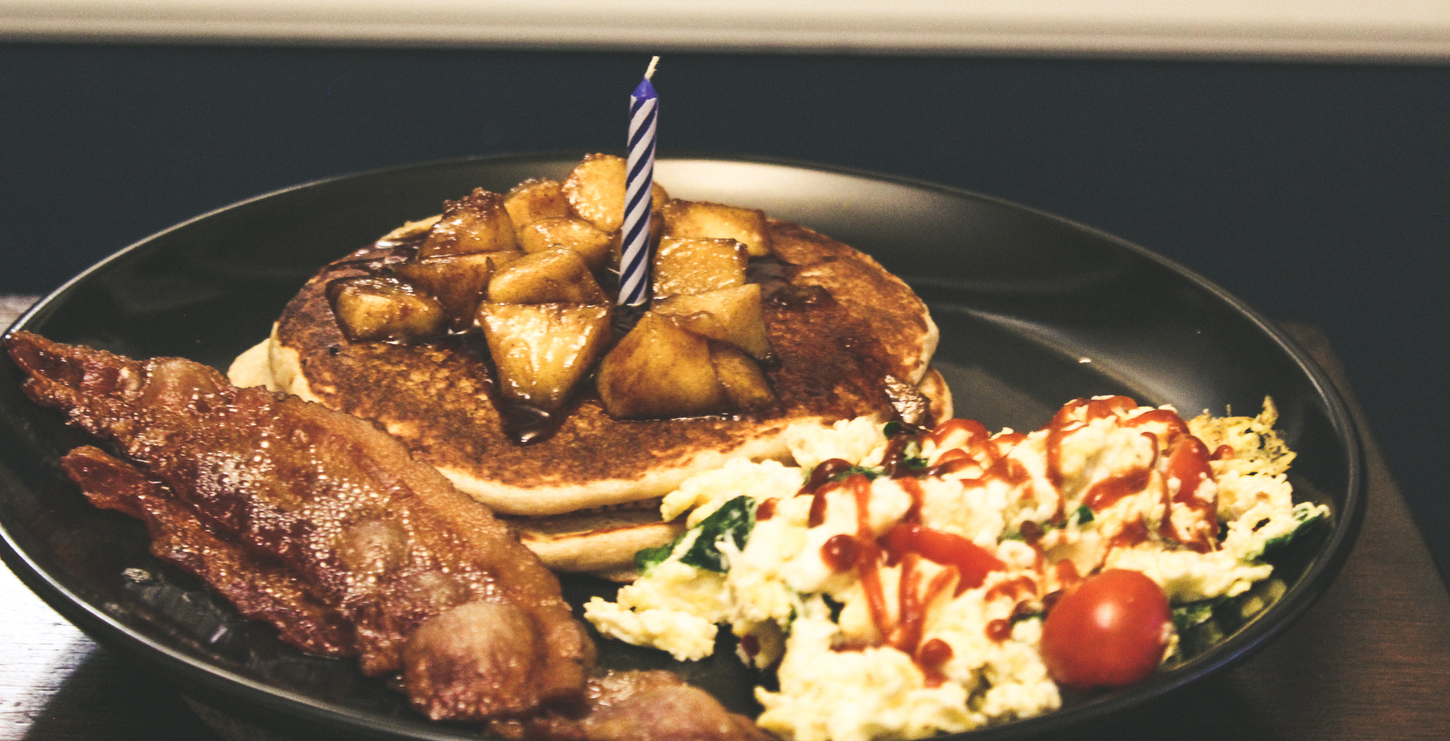 This week was also Haris’s birthday. Since I had to spend the day at work and then we were going off to see Mumford and Sons in the evening, I got up and made this very quick breakfast. (Sorry for the low image quality it was like 6am which means no sunlight and I didn’t grab my proper lighting set up either). The breakfast comprised of protein pancakes topped with apples and cinnamon, bacon and a Mediterranean style egg scramble.