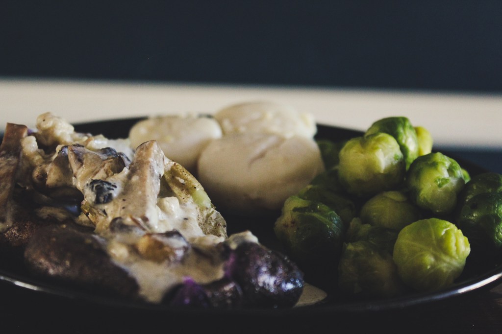 Ahhhhh now we come to dinner. I loved the mushroom sauce I made last week, so of course I had to make it again. This time instead of drizzling it over steak, I added it to the top of some smashed fingerling potatoes. Add some scallops that were cooked in a nice butter bath (not seared as you can tell, but just as good) and then grab some steamed in the bag brussel sprouts and there’s dinner.