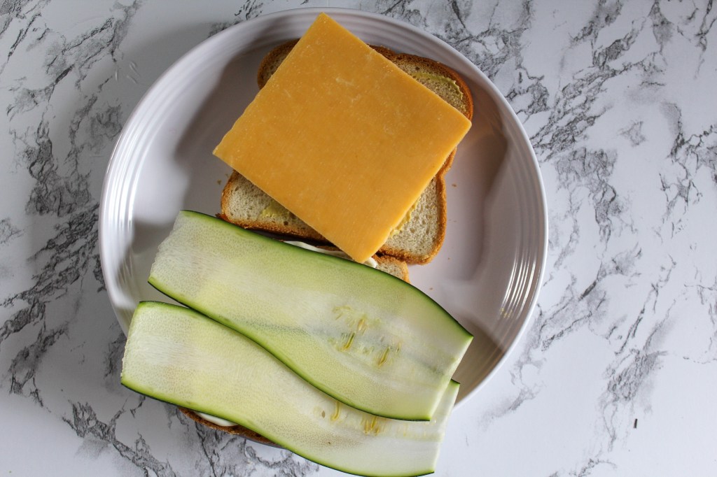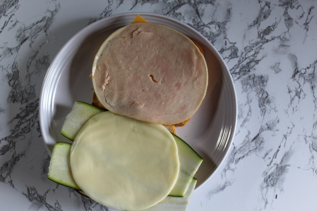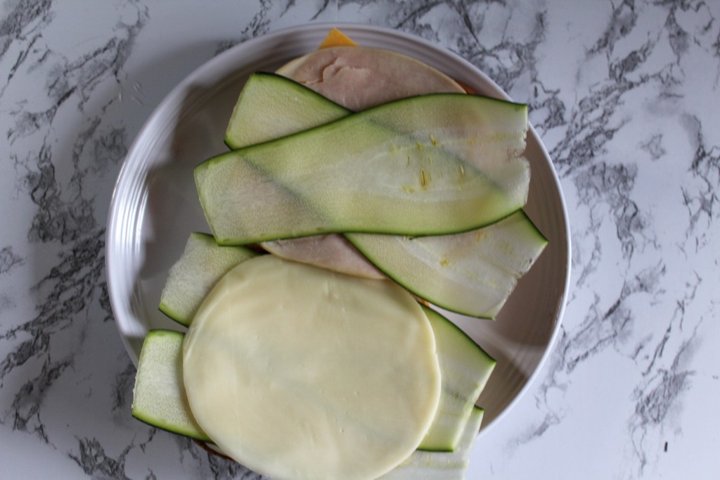 Step Three: Layer on the cheese, zucchini ribbons and turkey. I find it best to have a piece of cheese between two layer of zucchini ribbons to help them stick!