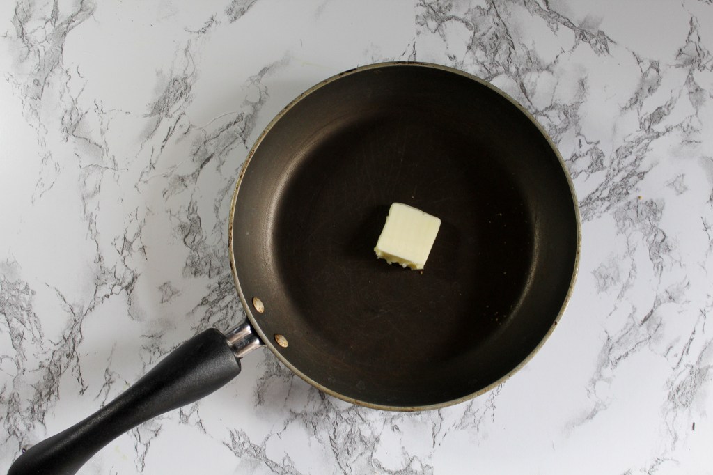 Step four: Grab a skillet and add some butter. Now traditionally you add butter to the bread, but a friend years ago taught me that not only is it easier, but it tastes better when you add it to the skillet instead!