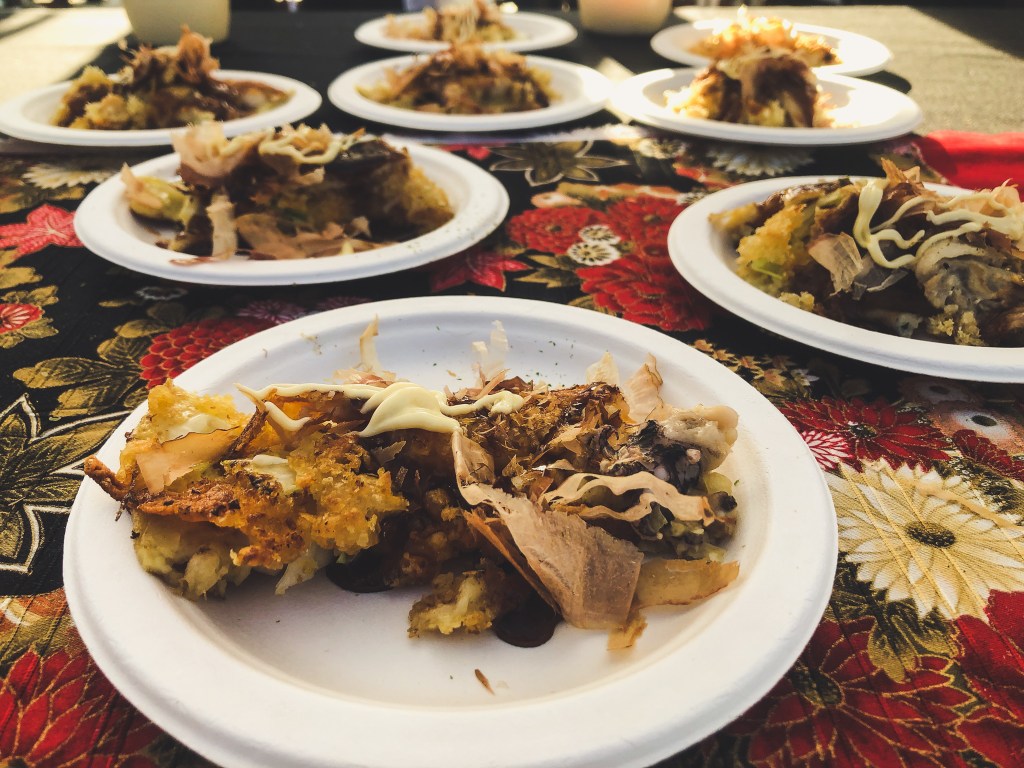 There was so much good food at this shindig (I just cut 5 photos from this blog though because it’s getting TOO LONG!). Below is a dish called Okonomi Yaki- savory pancake. These chefs were guest chefs: Ushiro Makoto and Honda Toshio from the Japanese restaurant called Tomoya. And boy was this a tasty treat! It’s always nice to see how other cultures view foods I eat regularly like pancakes, and believe me, I think these savory pancakes are something I’d be willing to eat often.