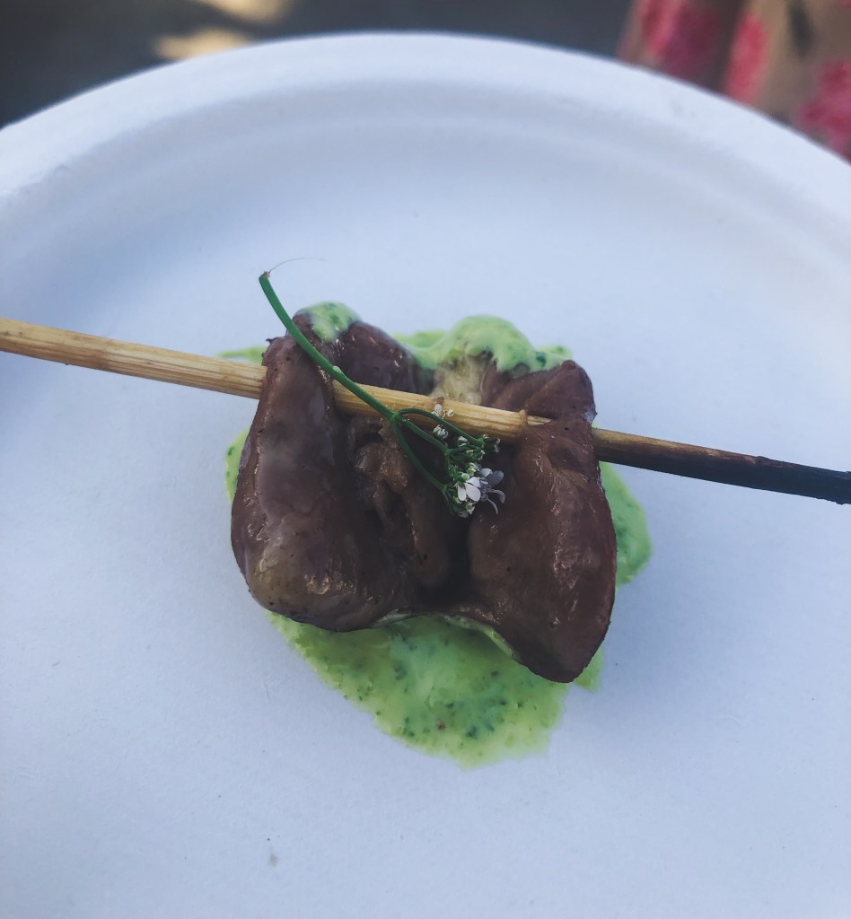 Alright… this next one I’m not gonna lie, I ate it before I knew what it was. I saw meat on a stick and said sign me up! What is it? Chicken Heart. Yep, you read that right, it’s a chicken’s heart… and it was amazing. I ended up eating like five of these bad boys. Shout out to the five chickens who died for me to eat this delicious food! This dish was cooked by Caroline Glover from Annette out in Stapleton.