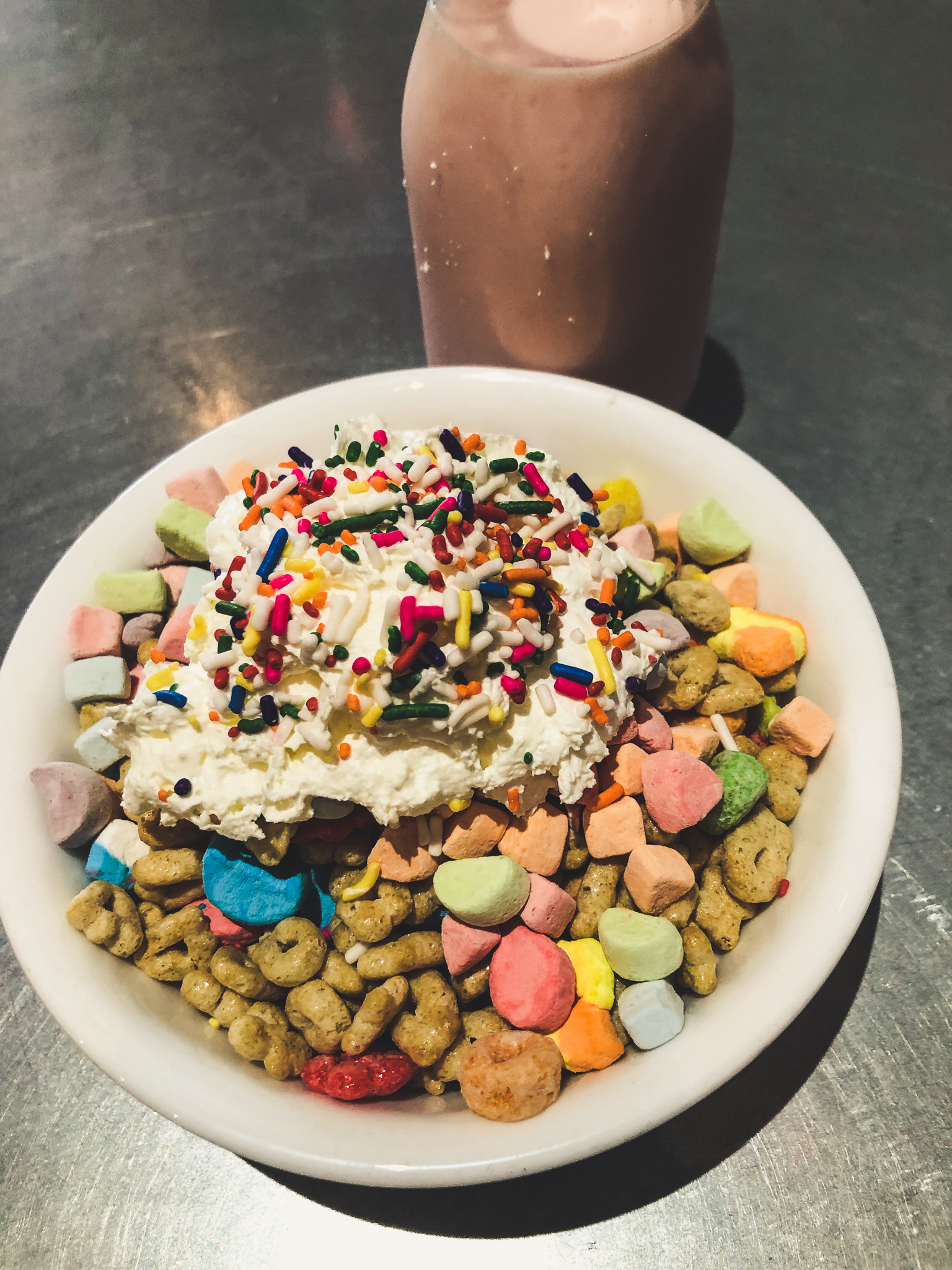 First up is Haris’s old man cereal: Squirrel Treats. This brown looking mixture is composed of: Honey Bunches of Oats, Honey Nut Cherrios, Grape Nuts, walnuts and almond milk. Haris wasn’t too excited to come on this adventure. I’m pretty sure his exact words were: “I don’t want to eat a bowl of sugar.” But being a team player he came along and got the most boring thing on the menu.
