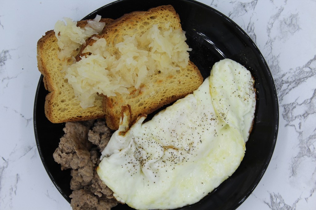 Now below is my normal daily breakfast. We have an over easy egg with extra egg whites, gluten-free toast with sauerkraut and some pork sausage. It takes about 5 minutes to make (I make the pork sausage in a huge batch on Monday and then eat on it all week).