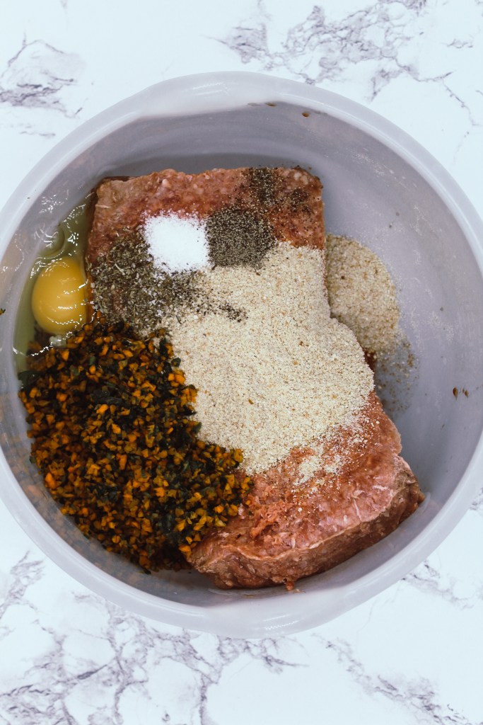 Second Step: Chop up your veggies. I like adding hidden veggies into my meatballs, and you will want to dice them up nice and small. They don’t add much flavor to the meatball hence why I call it hidden. I used my Ninja chopper to dice my veggies.