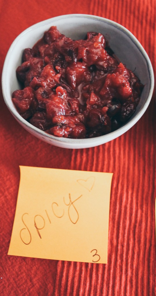 Here in the third position we have a Spicy and Sweet Cranberry Sauce. Haris loves all things spicy so I thought, why not try this recipe out. It’s a little more complex than the other two recipes. The spicy flavors come from chipotle peppers in adobe sauce and serrano peppers. Now I added more of the serrano peppers than the recipe calls for to turn up the spice a bit, which seemed to be a crow pleaser. If you are looking for a way to spice this Thanksgiving up, this is the way to go!