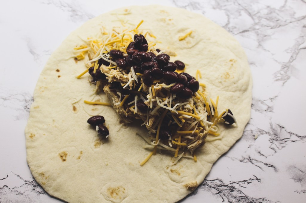 Four: Get all your ingredients out. Lay out a tortilla and generously spoon some chicken and beans on it and sprinkle a TON of cheese over all of that!