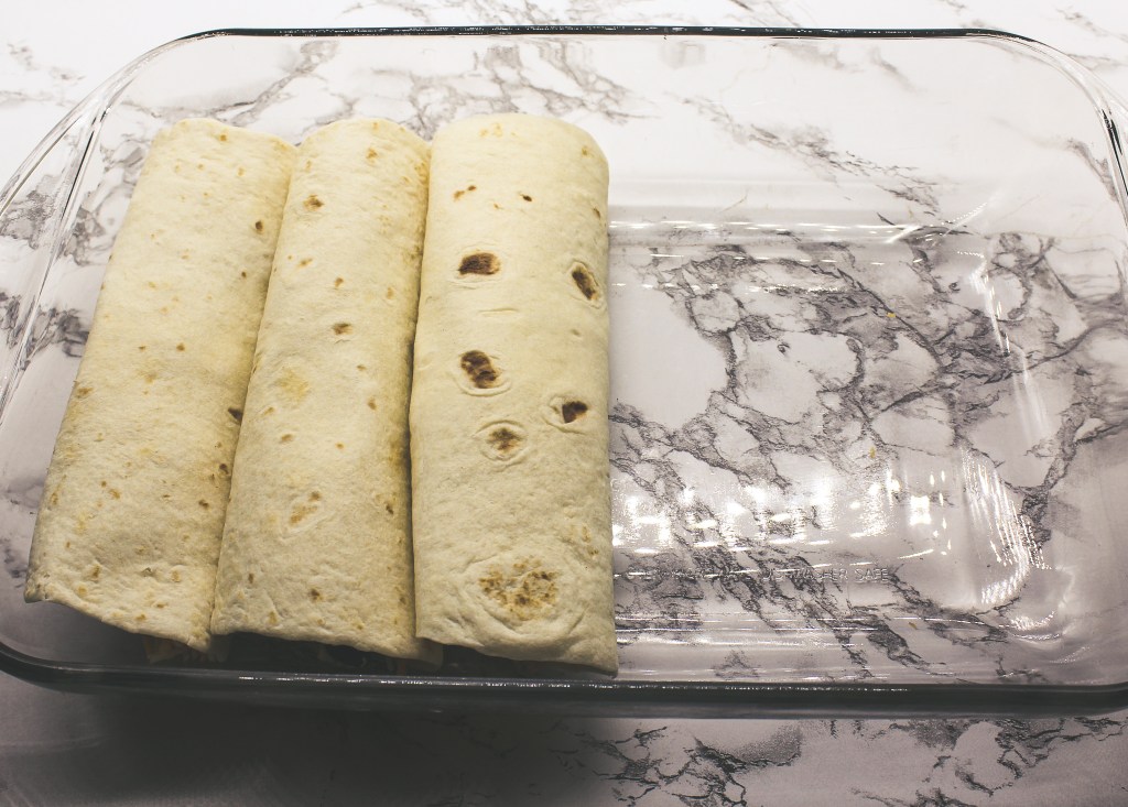 Five: Roll the tortilla up and tuck it in nicely to your Pyrex dish or whatever you have.