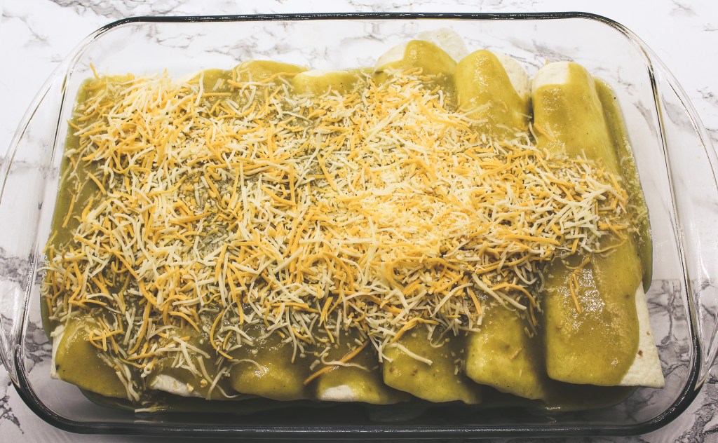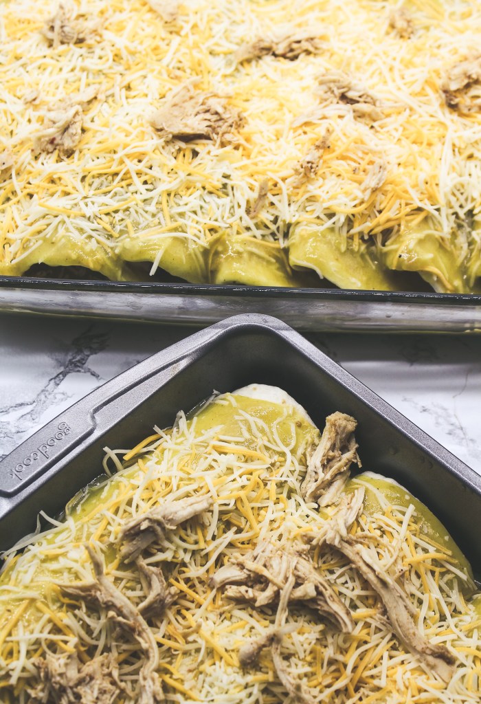Seven: Pour that green chile sauce all over the tucked in tortilla rolls. Generously add the cheese to the top. I added some leftover shredded chicken over that. Do it or don’t it won’t make a difference.