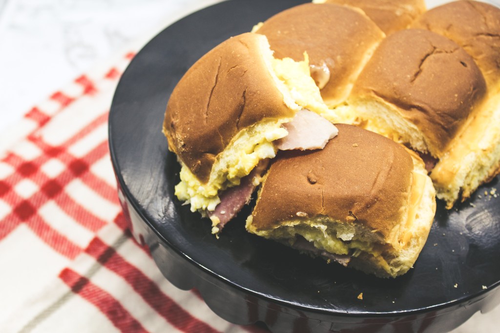 Second up are these Ham, Egg, and Cheese Breakfast Sliders. These are super simple to make. All you need to buy is: Hawaiian sweet rolls, deli ham, eggs, american cheese. Soft scramble some eggs; cut open the rolls; layer cheese, ham, eggs on the bottom layer of bread; put the top of the rolls back on; and bake in the oven (350 degrees) for 10 minutes; cut along the lines of the rolls and then serve it all up! These are great!