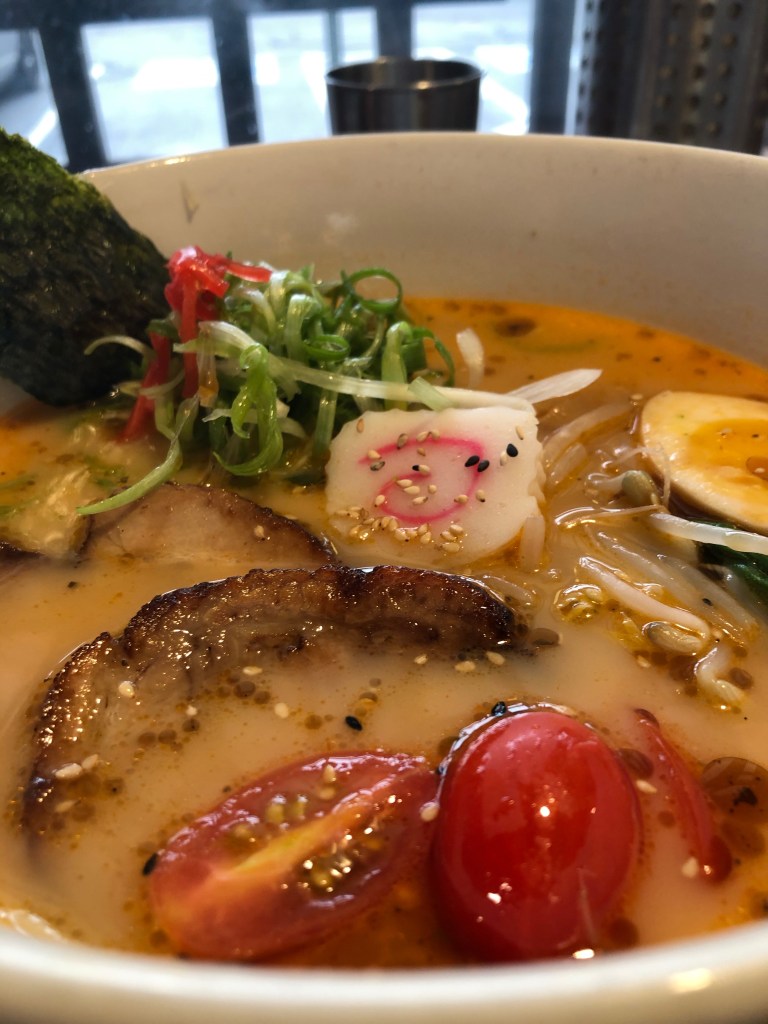 As you can see the broth in my order below looks a little redder in color. That’s because its a Bloody Mary Tonkotsu ramen. It has all the same ingredients as Haris’s order except it also comes with tomato soup and tomatoes in it. It’s a great twist on a classic rainy day ramen and a rainy day soup option and it tasted amazing!