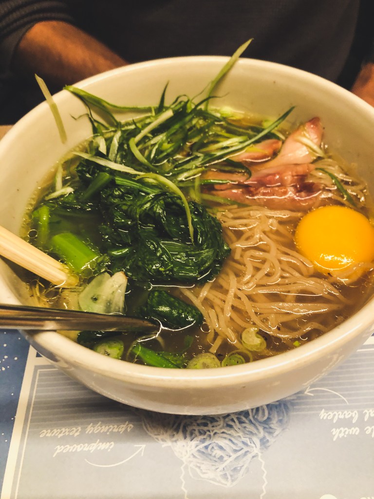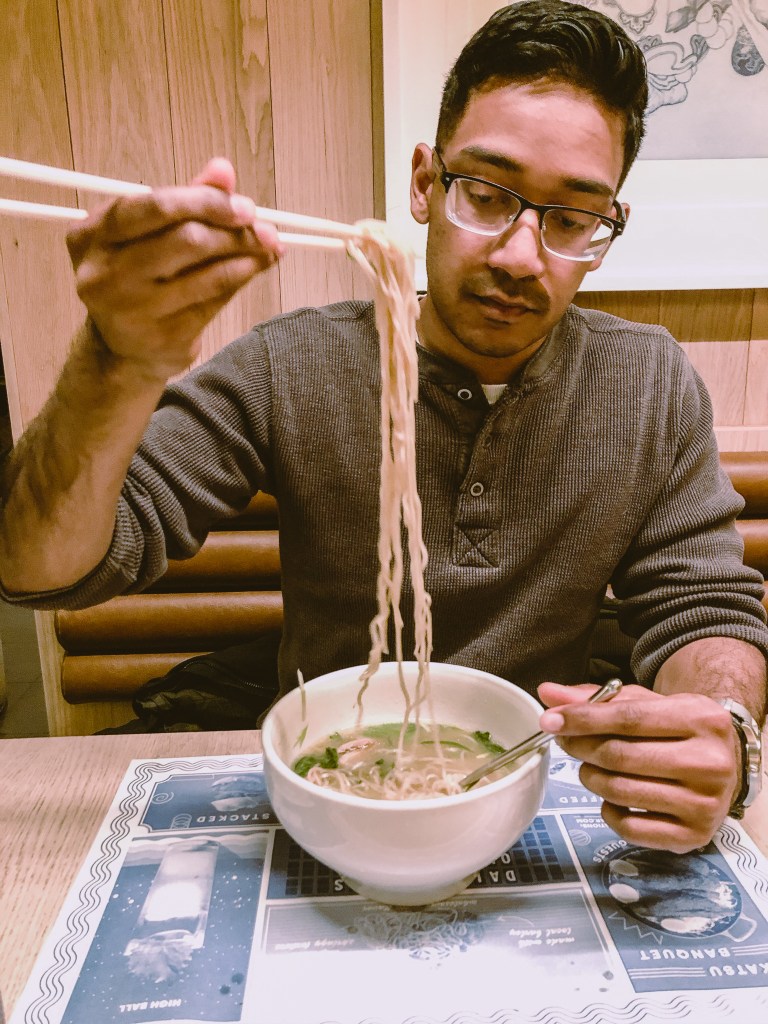 Haris always has the most interesting takes on food and one of my goals of 2020 is to give you all a little more of those thoughts! But anyways, on to the main event- the Ramen! Haris ordered the ramen above: the Garlic Chicken Ramen. This ramen includes yu choy, egg yolk and bamboo. And it got the Haris stamp of approval, even if his face doesn’t show it in the picture below.
