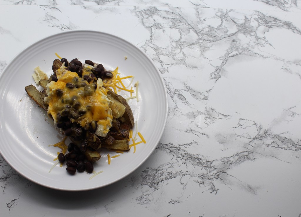 Now my lunches took a left turn this week. Sometimes our fridge gets a little full with four people and things can get left out on a counter in the shuffle of things. And that happened this week with the ground chicken I had marinating in the fridge to make chicken nuggets this week… so we improvised. I had back-up chicken in the fridge, cheese and black beans. I was already making homemade french fries so I just added everything to the top of those fries and bam! a great lunch was born. Sometimes the best meals are born out of improvisation.