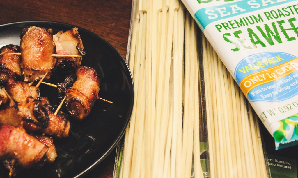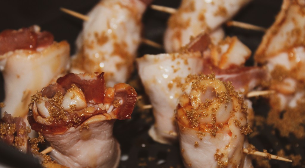 Step 10: Place the rose on the seaweed and poke the skewer through the seaweed and bacon roses. (see picture above.